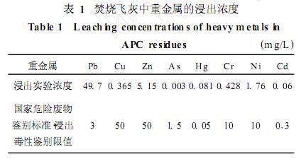 飞灰样品取自上海某大型生活垃圾焚烧发电 厂 ,处理规模为 1000 t /d,多级炉排式焚烧炉 ,石灰 (CaO)半干法尾气处理工艺。表 1中给出了取自该 厂供实验用原状飞灰的重金属浸出浓度 ( G B5086 . 12 1997) ,与标准限值相比 ,其中 Pb超标 15倍多 , Hg 超标 62%。