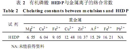 有机磷酸 HEDP为羟基亚乙基二膦酸的简写 , 购自华东地区某化工厂 ,商品级。该产品活性组分 含量 ≥5010% ,磷酸 (以 PO3 - 4 计 )含量 ≤1 . 0%。 HEDP能与 Fe、 Cu、 Al和 Zn等多种金属离子形成稳 定的络合物 ,其与一些金属离子的络合常数如表 2 所示[ 7, 8 ] 。