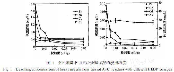 所示 , Pb、 Zn和 Hg的浸出浓度随着 HEDP的剂量增