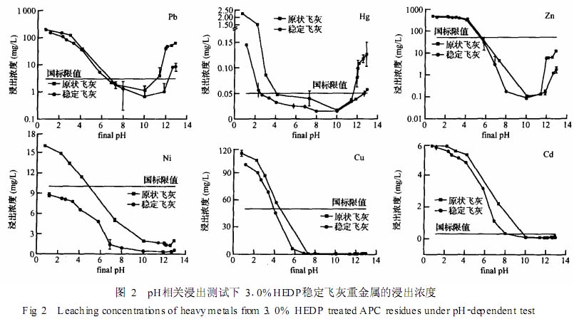 Ni、 Cu和 Cd不是两性重金属 ,其浸出行为与 Pb、 Hg和 Zn不同 ,在强碱性溶液中会与 OH- 结合 生成沉淀 , 仅在强酸溶液中有高浓度浸出。 0103 mL /g HEDP稳定后飞灰与原状飞灰相比较 , 满足 Ni、 Cu和 Cd浸出浓度达标的浸出液 pH值范 围均有不同程度的拓宽 ,其中 Ni可在研究的全 pH 值范围内达标。