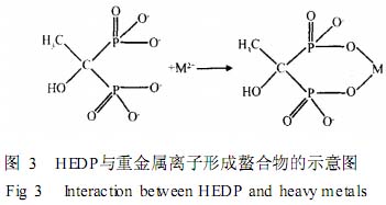 HEDP在水溶液中能够离解成 H+ 和酸根负离 子 ,可与许多重金属离子形成稳定的六元环螯合物。 图 3给出了一个金属离子与 HEDP分子形成螯合物 的平面图 ,而实际上一个 HEDP分子可以和 2个或 多个金属离子螯合 ,形成立体结构的双环或多环螯 合物。HEDP与溶液中重金属离子络合后,会形成 难溶物在飞灰中沉淀 ,使重金属得到稳定[ 7, 8 ] 。